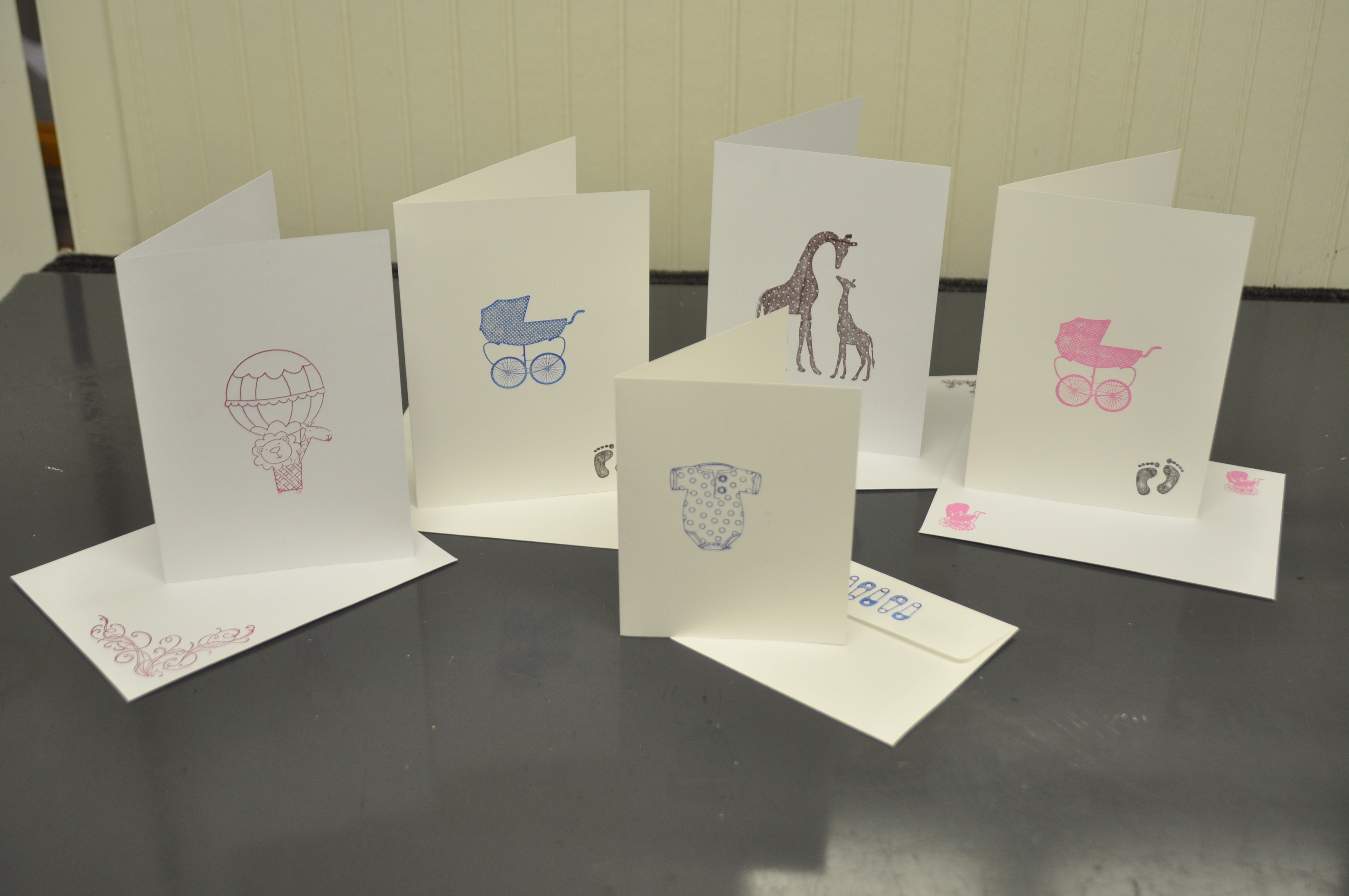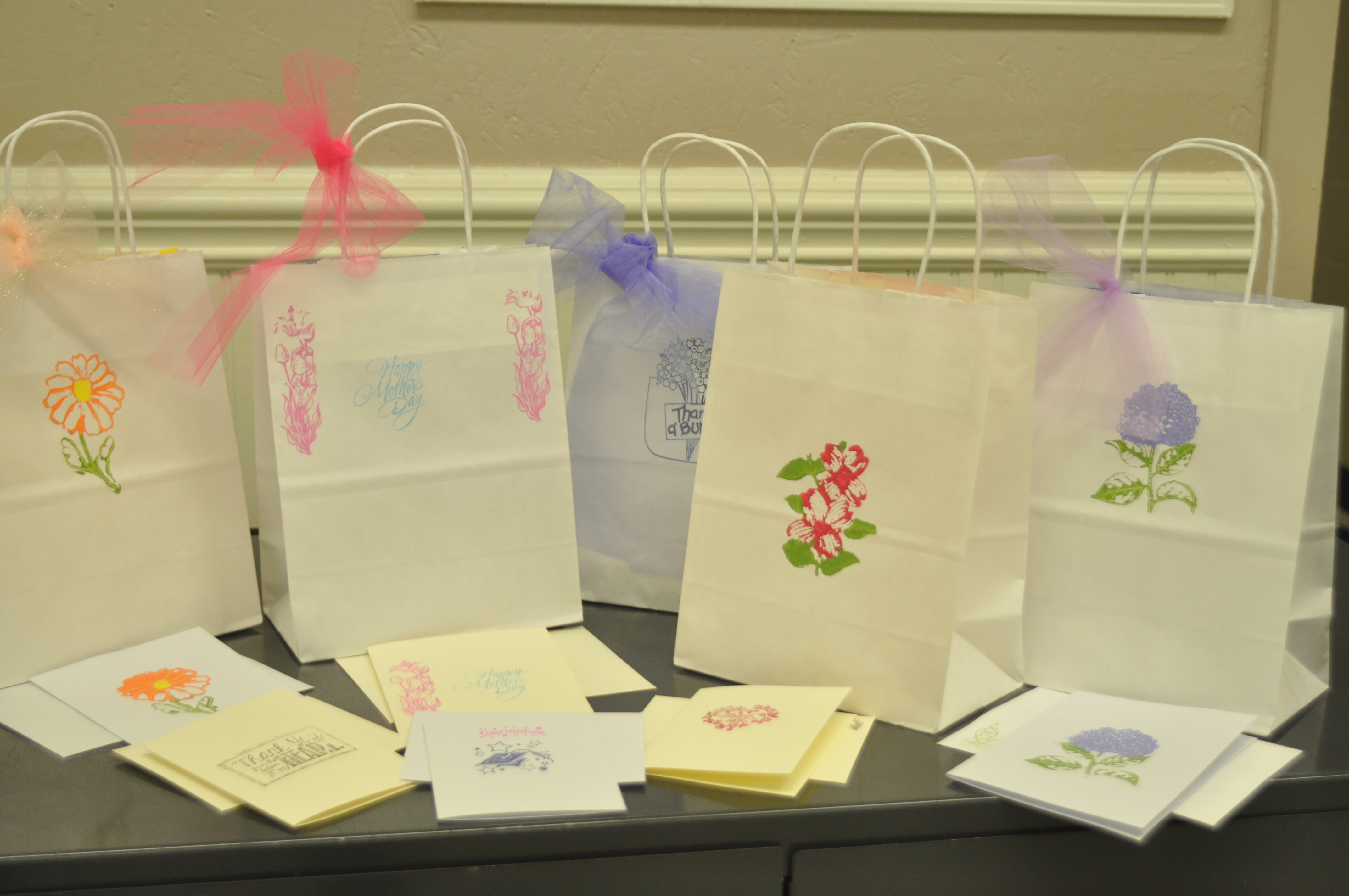 Our second business is greeting cards and gift bags. Using a variety of stamps and ink and paint, the students decorate bags and cards for holidays, weddings, baby showers, etc. Each bag comes complete with tissue paper and tulle bows. We sell them individually or in sets (bag, bows, tissue paper and matching cards).